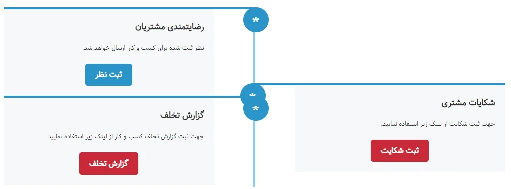 در این صفحه چنانچه از عملکرد سایت رضایت داشتید میتوانید نظر خود را در قسمت “ثبت نظر” درج کنید. و چنانچه تخلفی در سایت مشاهده کردید بهتر است ابتدا آن را از طریق فرم تماس با ما به ما اطلاع داده تا ما آن اشکال را برطرف کنیم. درصورتی که آن تخلف بعد از سپری شدن ۴۸ ساعت هنوز در سایت وجود داشت میتوانید از طریق دکمه ثبت شکایت نظر خود را درج کنید.